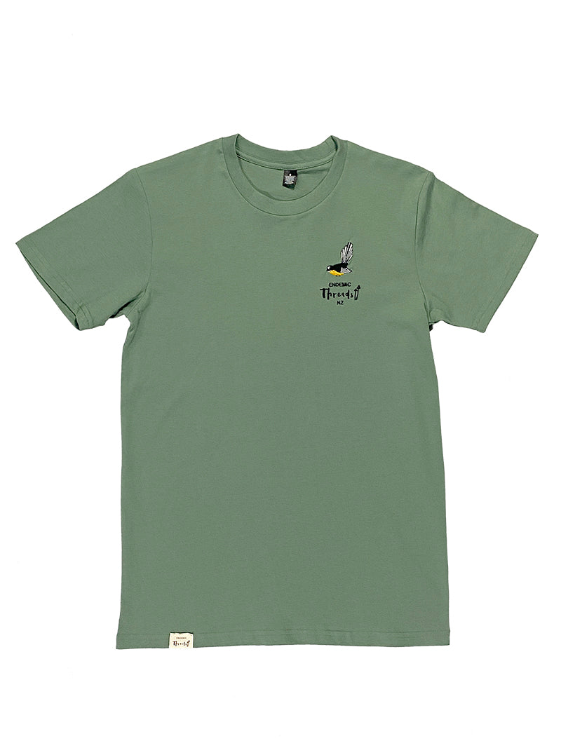 Embroidered Fantail on sage-coloured T-shirt